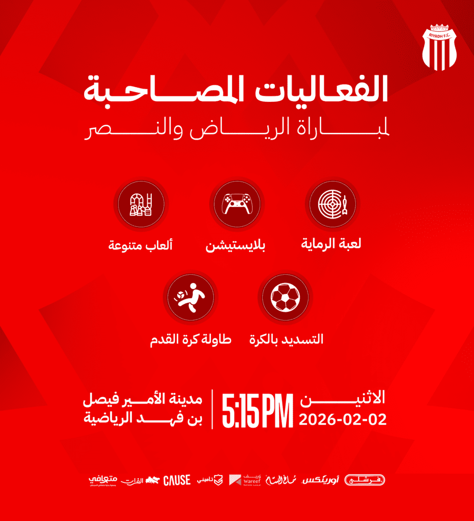 جمهورنا الغالي.. ندعوكم لحضور الفعاليات المصاحبة لـمباراة الرياض و النصر في منطقة الفعاليات
